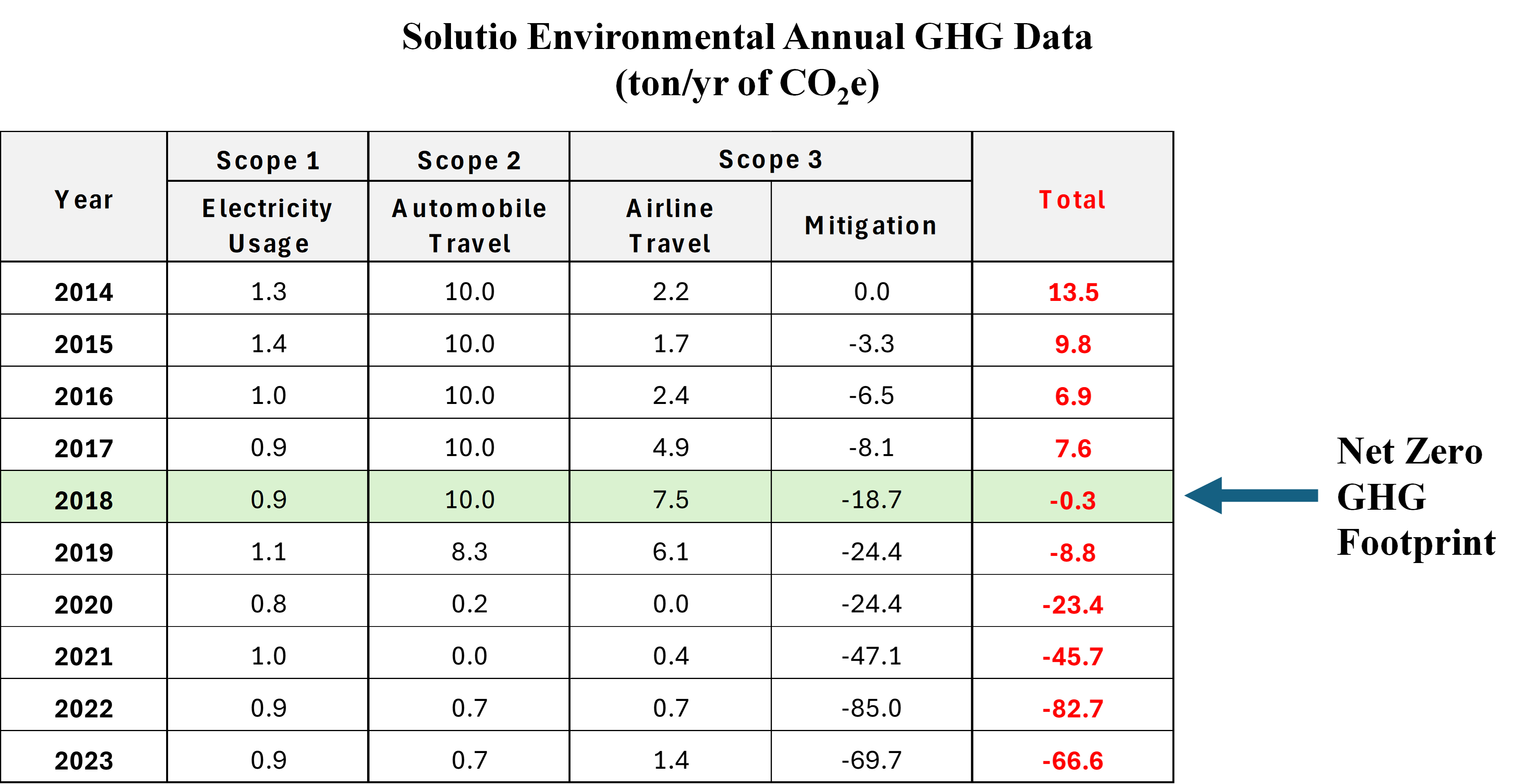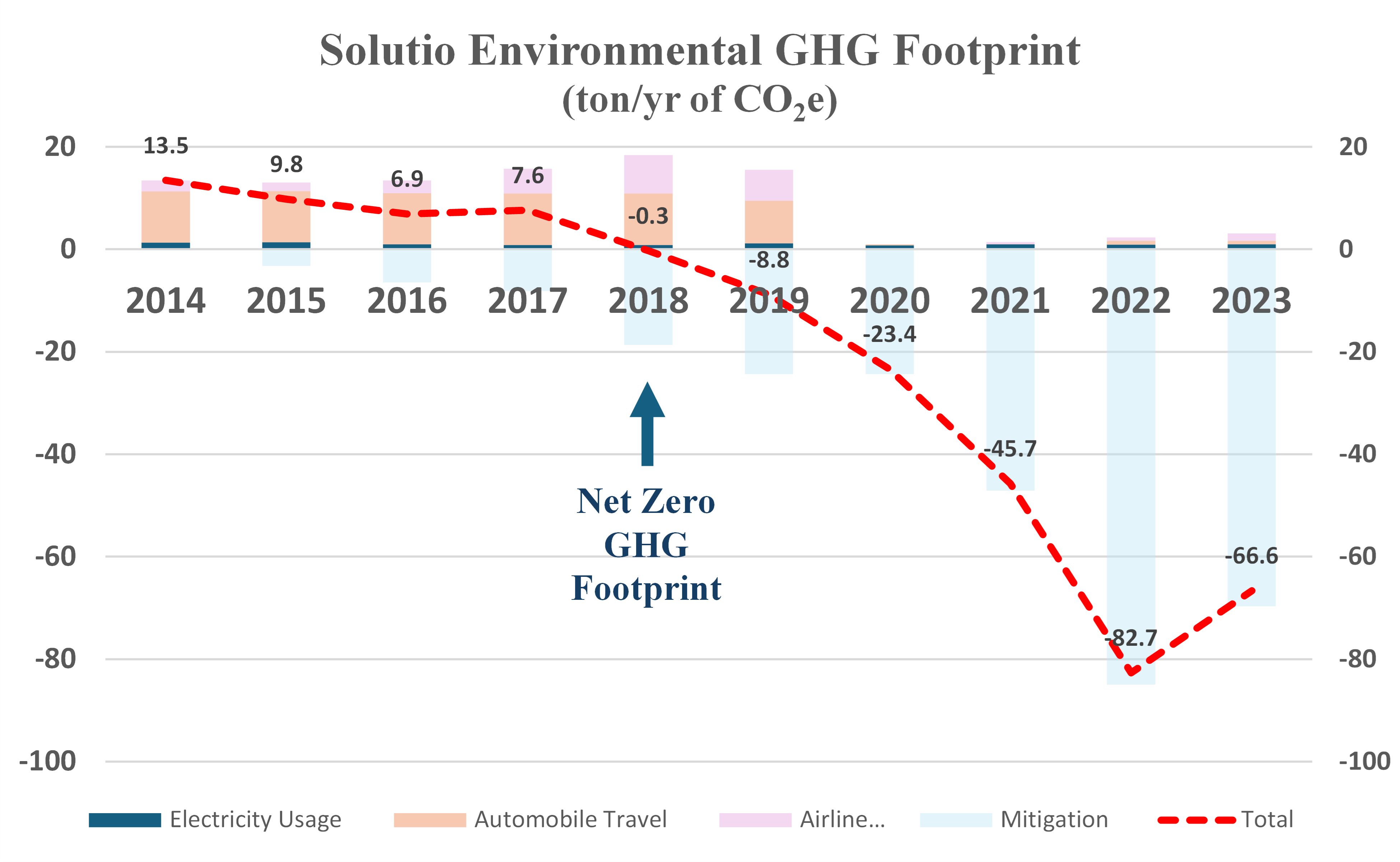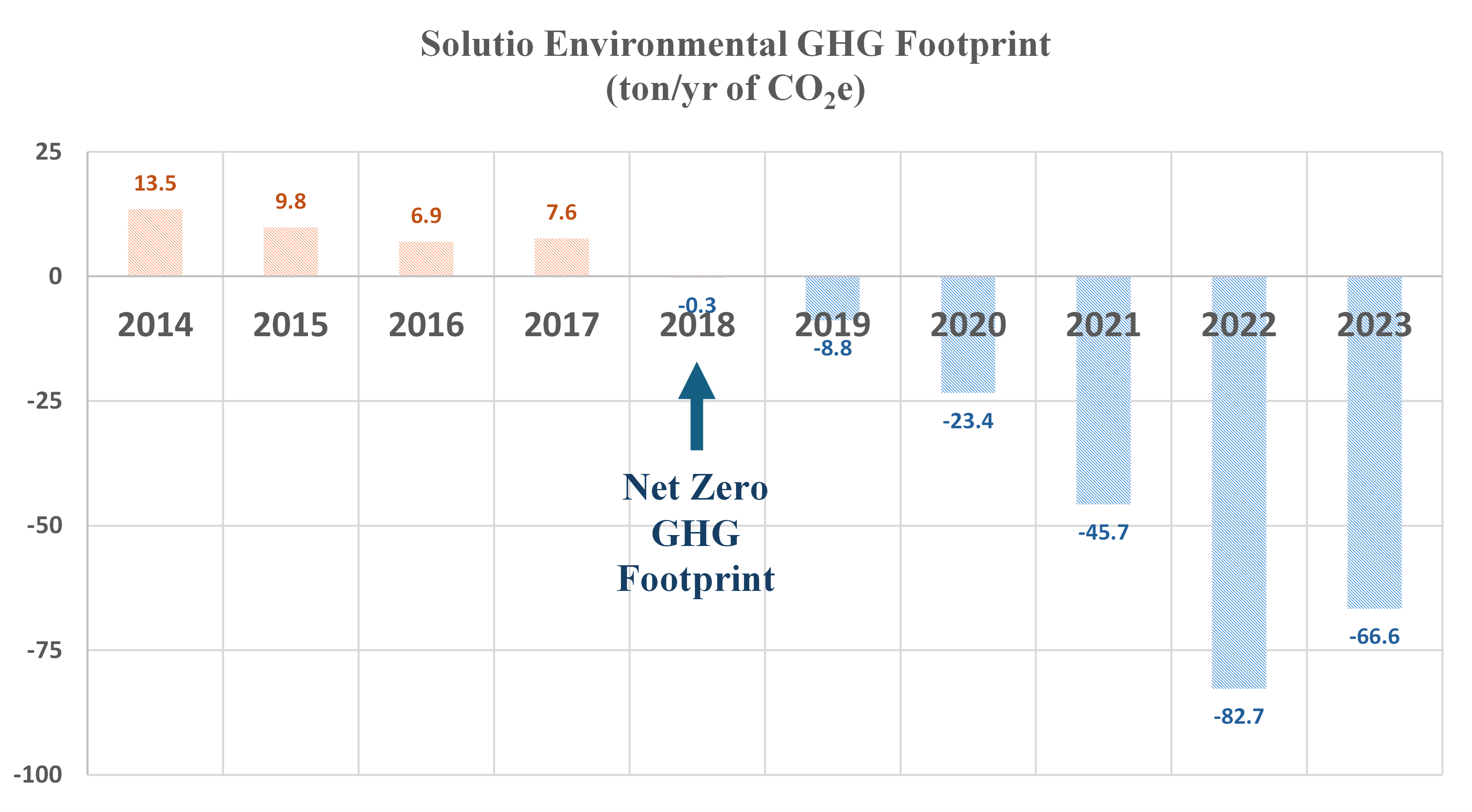 As a result, Solutio was already actively pursuing GHG reductions/mitigations before the 2015 UN's Climate Change Paris Agreement. Furthermore, we achieved a net zero GHG footprint well before the Intergovernmental Panel on Climate Change (IPCC) 2023 call for net zero by 2050. In fact, we exceeded our own expectations and reached a net zero GHG footprint in 2018; only taking four years! To this day we are actively pursuing new innovations to continue maintaining a sub-net zero GHG footprint to the fullest extent attainable and have already reduced our GHG footprint by 595% (from 13.5 ton/yr to -66.6 ton/yr).