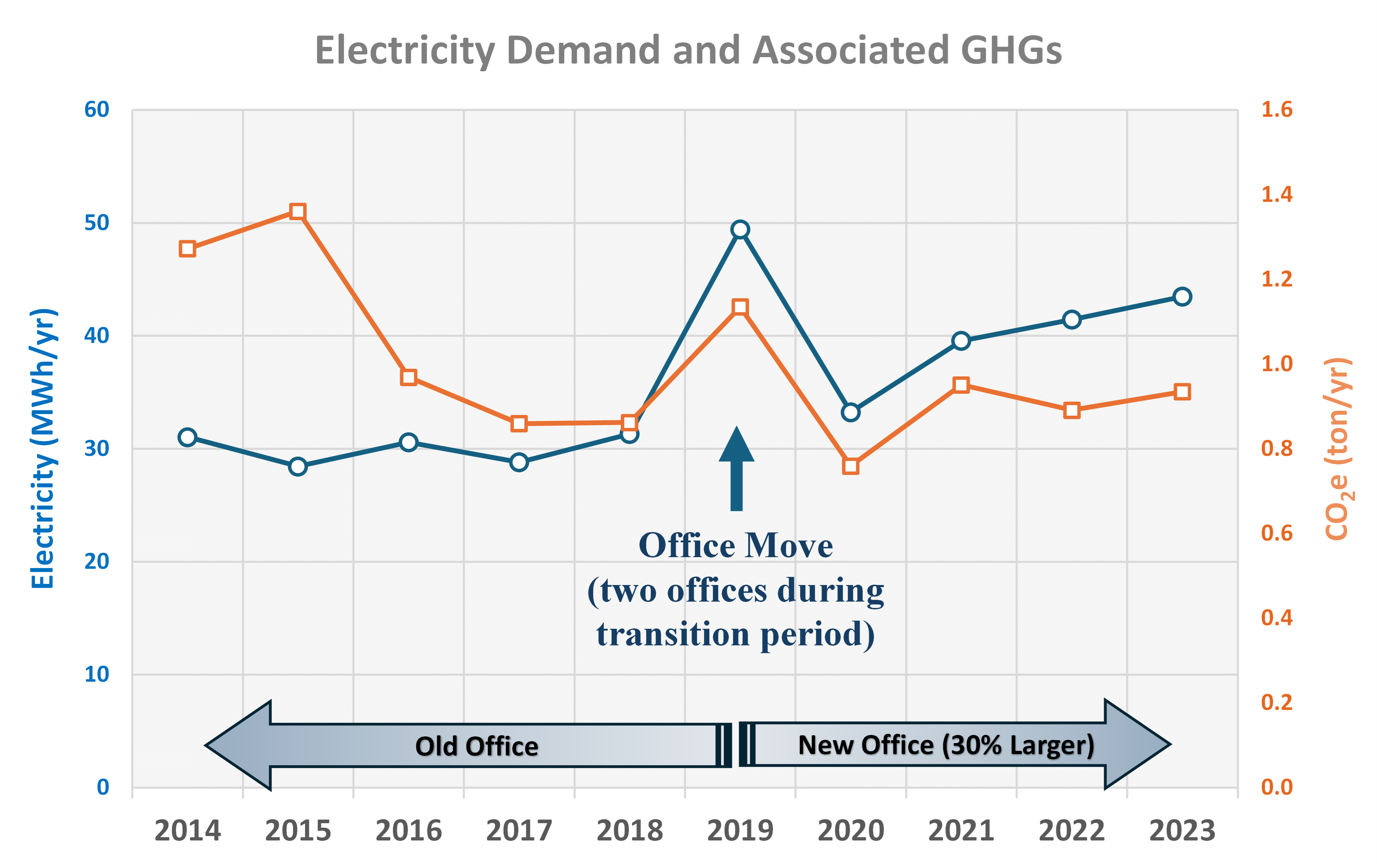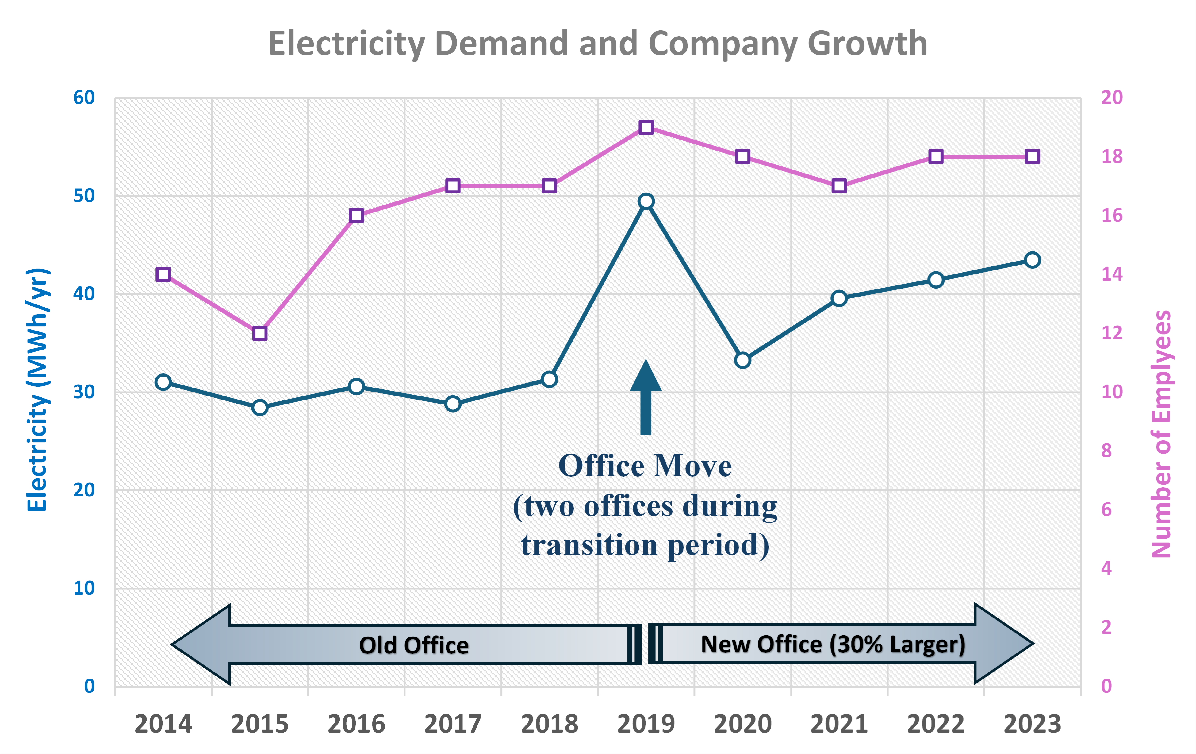 Historically Solutio's electricity consumption is a direct function of our company's growth and implementation of GHG mitigation measures; both consider the cost of doing business. Our two major growth factors were increases in personnel and the subsequent need to move to a larger office. From 2014 to 2023 Solutio personnel count grew by 29%, resulting in our transition into a 30% larger office building and increasing our electricity demand by 40%. Additionally, Solutio initiated an advanced, interactive, web-based training platform (e-Training) to mitigate GHG emissions; however, these initiatives slightly increased our electricity consumption. While our electricity consumption was up by 40% due to company growth and initiatives, our GHG emissions associated with electricity consumption dropped by 27% due to green energy efforts of the local utility.